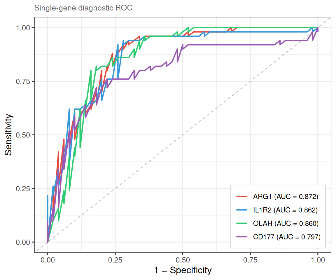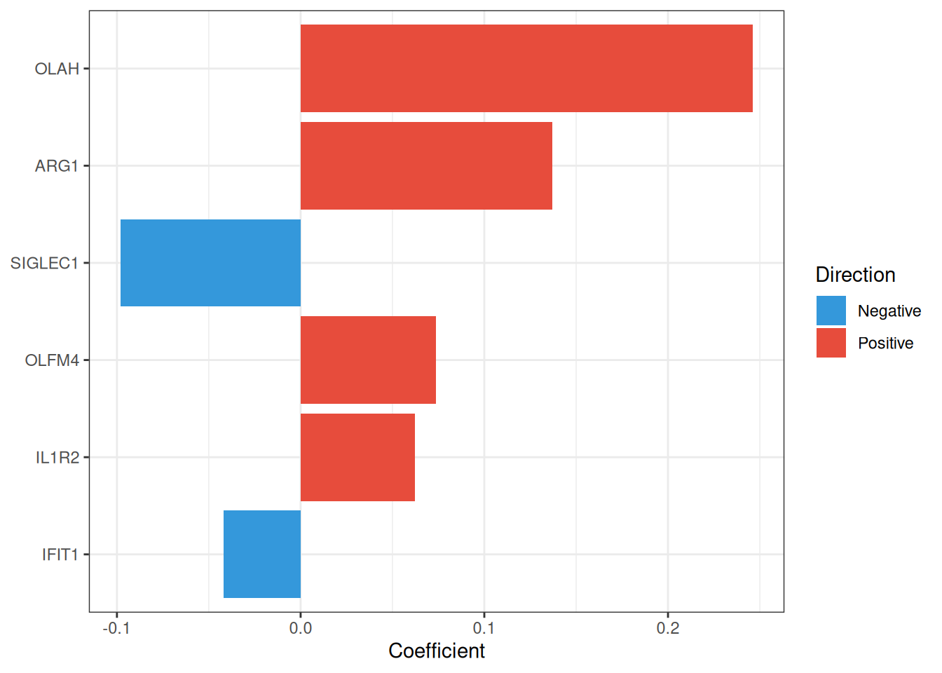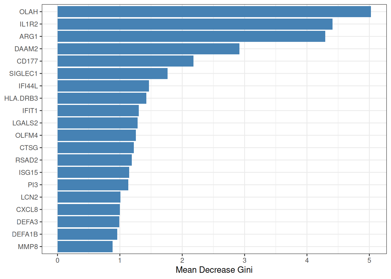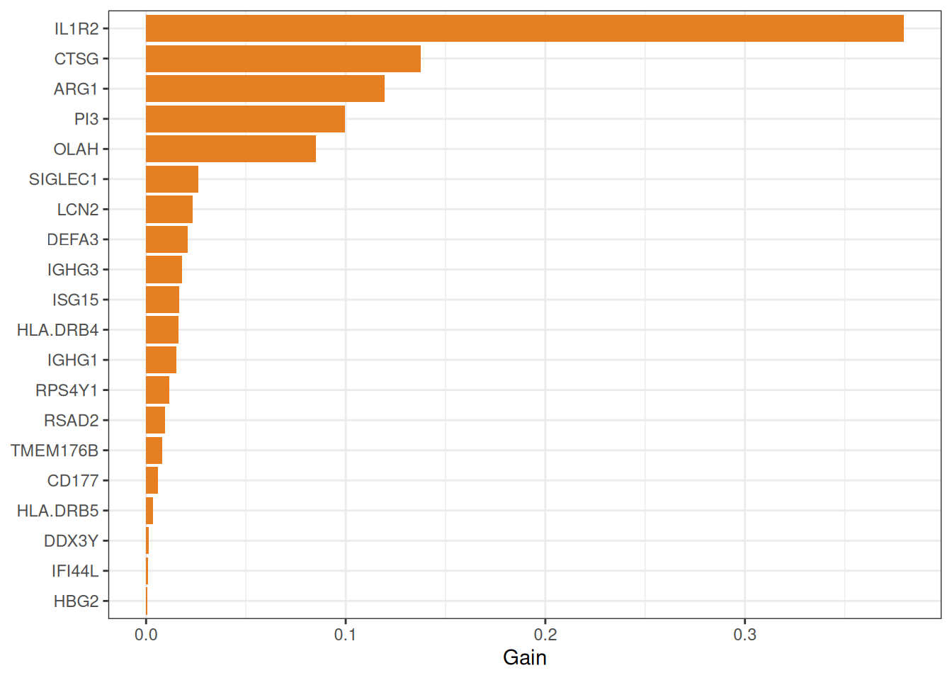 #> RPS4Y1, EIF1AY, HLA-DRB4, DEFA3, IFI27, IGHG1, HLA-DRB3, IGLC2, IGHA1, OLAH, DEFA1, IGLC3, DDX3Y, DEFA1B, IGLC1, JCHAIN, IGHG3, LGALS2, IGKC, CD177, OLFM4, HLA-DRB5, RSAD2, DEFA4, IGHG2, GSTM1, MMP8, IFI44L, HBG2, ISG15, TMEM176B, ARG1, CTSG, LTF, HBA2, HBG1, IFIT1, IL1R2, IGHM, CXCL8, SIGLEC1, IGHG4, IGLL5, LCN2, MZB1, DAAM2, HBA1, PI3, HBD, IGHA2