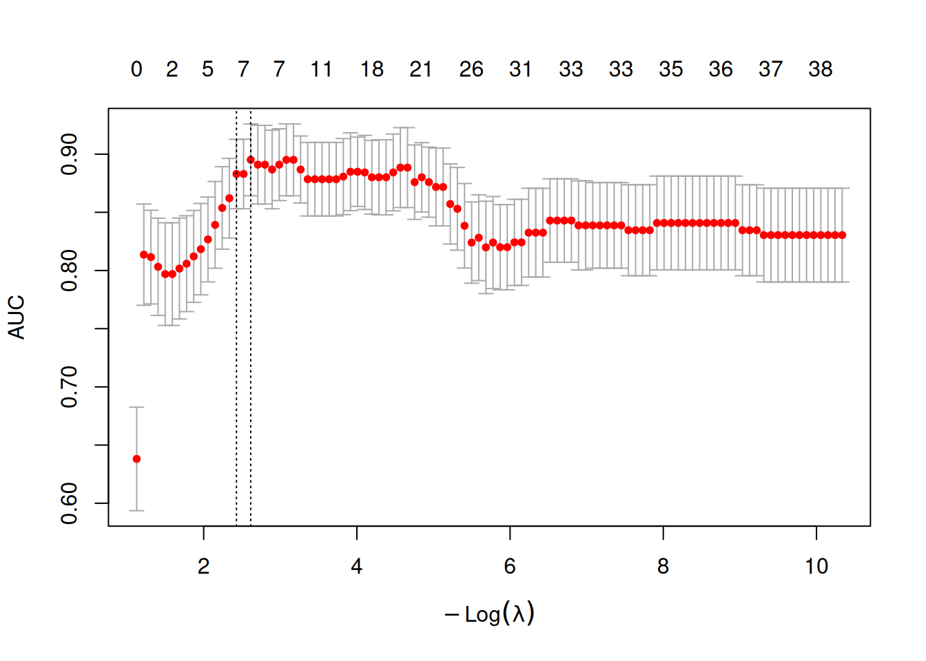 The cross-validation curve shows the AUC (or deviance) as a function of \(\log(\lambda)\). The two vertical dashed lines mark lambda.min and lambda.1se: