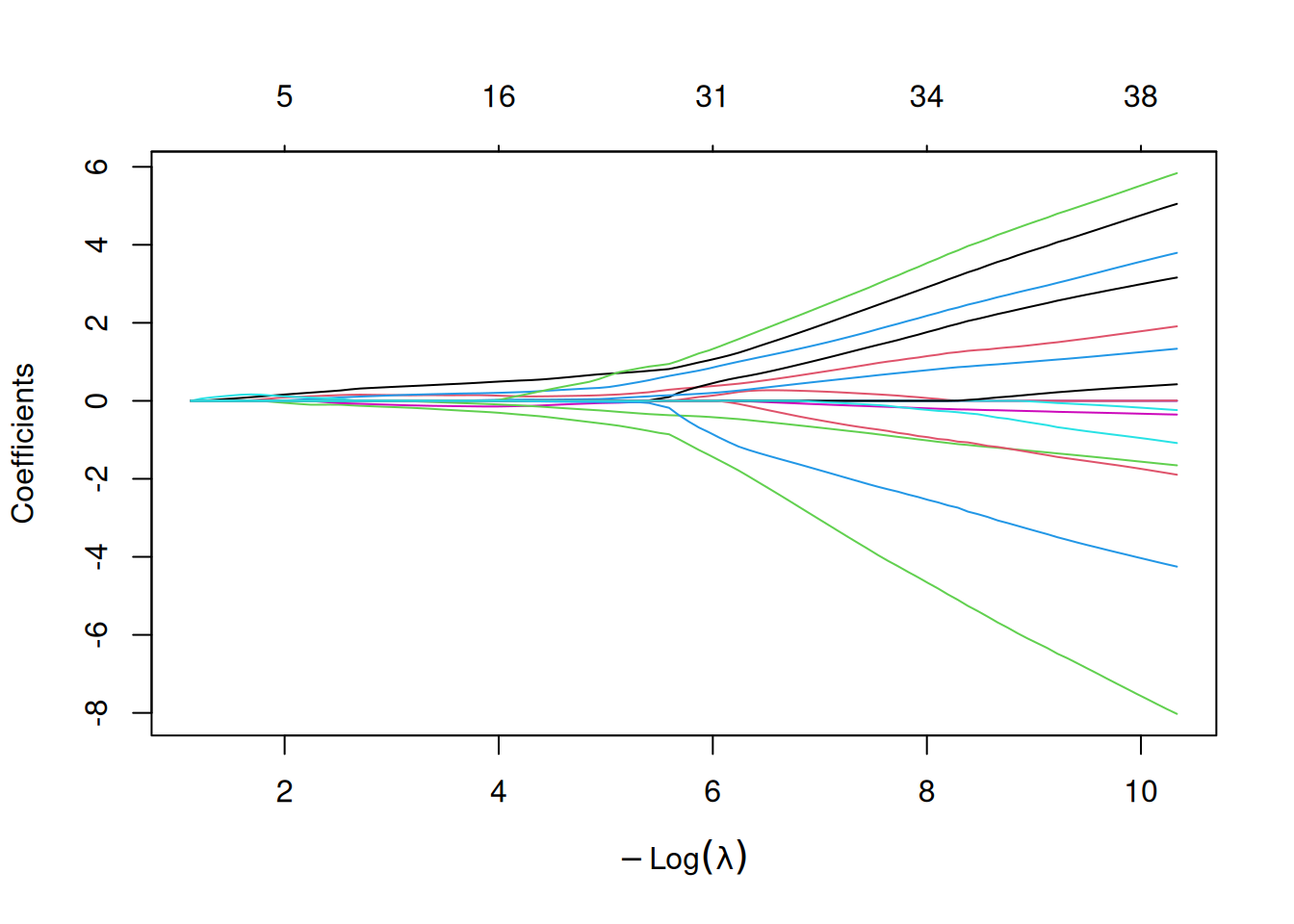 The Least Absolute Shrinkage and Selection Operator (LASSO)[2] applies an \(L_1\) penalty to logistic regression, driving irrelevant coefficients exactly to zero and thereby performing automatic feature selection. The penalty strength \(\lambda\) is selected via cross-validation; ml_lasso() supports both lambda.min (lowest CV error) and lambda.1se (most parsimonious model within one standard error), with the latter being the default.