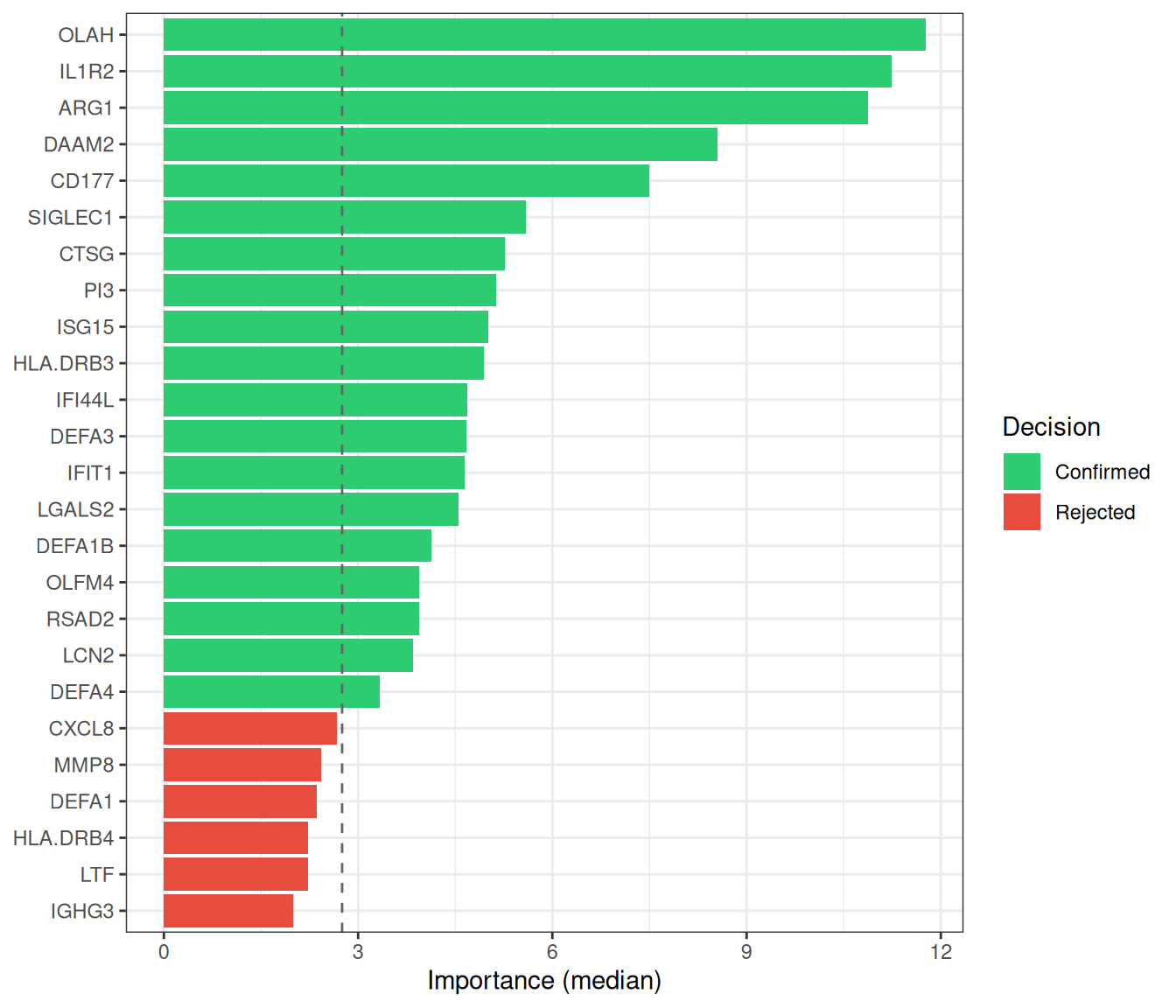 Random Forest (RF)[3] constructs an ensemble of decision trees, each trained on a bootstrap sample of the data. Feature importance is quantified by the mean decrease in Gini impurity (or accuracy) across all trees. To move from importance ranking to formal feature selection, ml_rf() employs the Boruta algorithm[4], which compares each real feature’s importance against that of randomly shuffled “shadow” copies; only features that consistently outperform their shadows are confirmed as relevant.