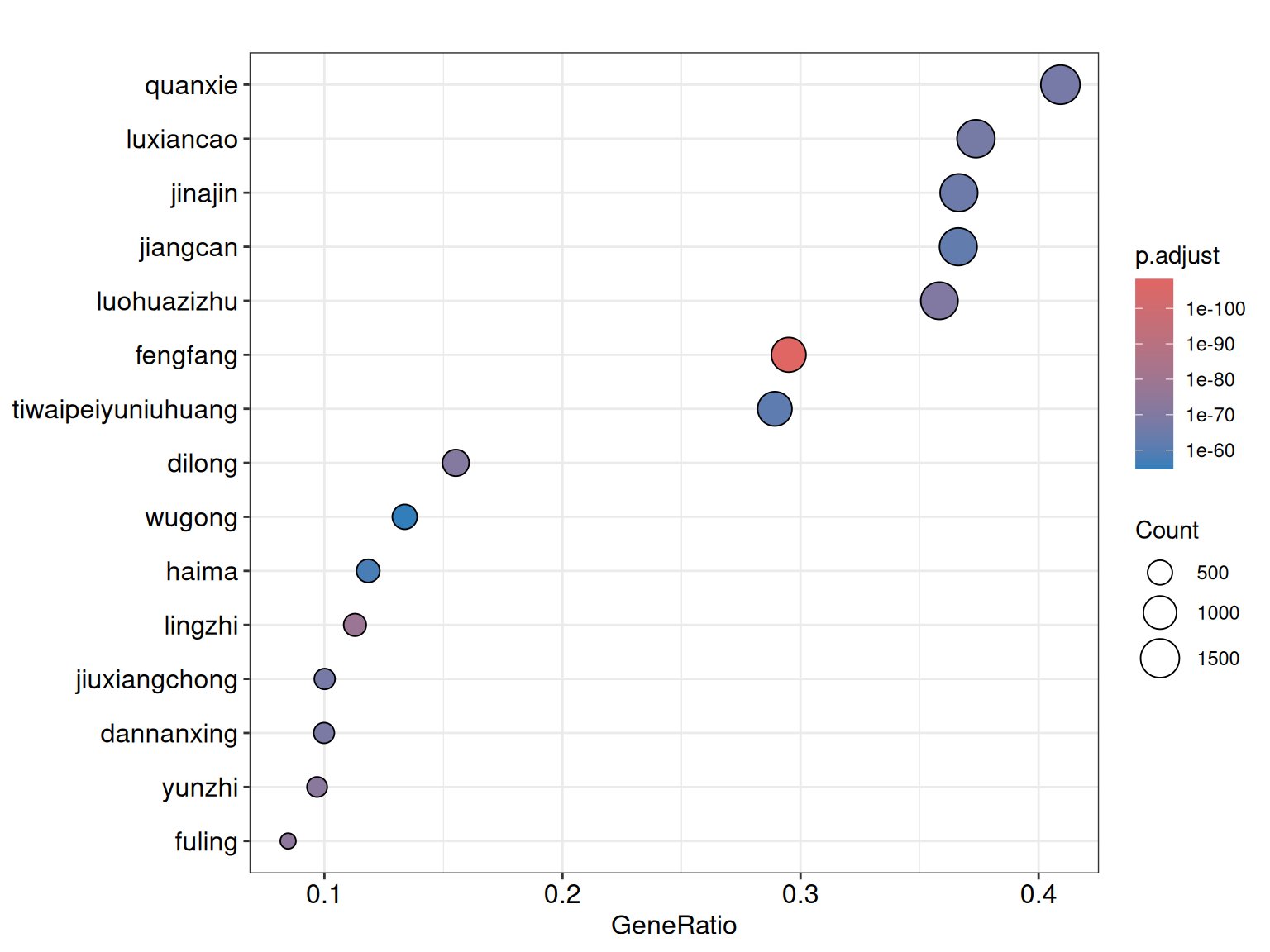 The returned enrichResult object is compatible with all enrichplot visualization functions. Below we show a dot plot highlighting the top 15 enriched herbs: