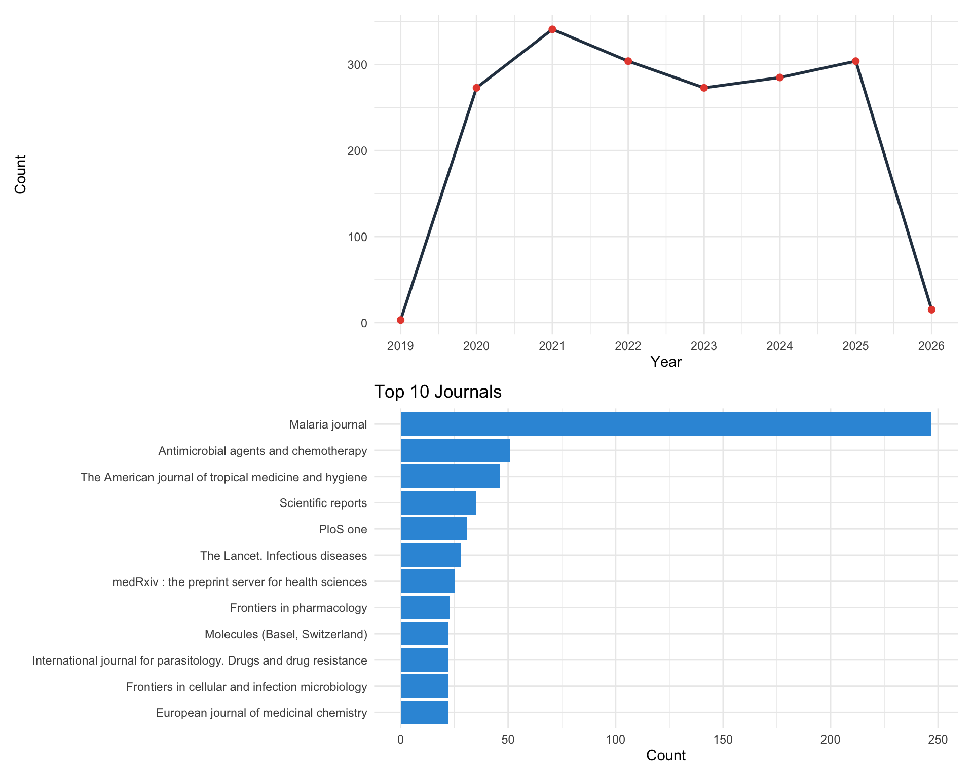 )If year_range is not specified, the function defaults to the most recent 10 years. The retmax argument controls the maximum number of records retrieved; setting retmax = "all" fetches all matching records, which is recommended when accurate annual trend statistics are needed.