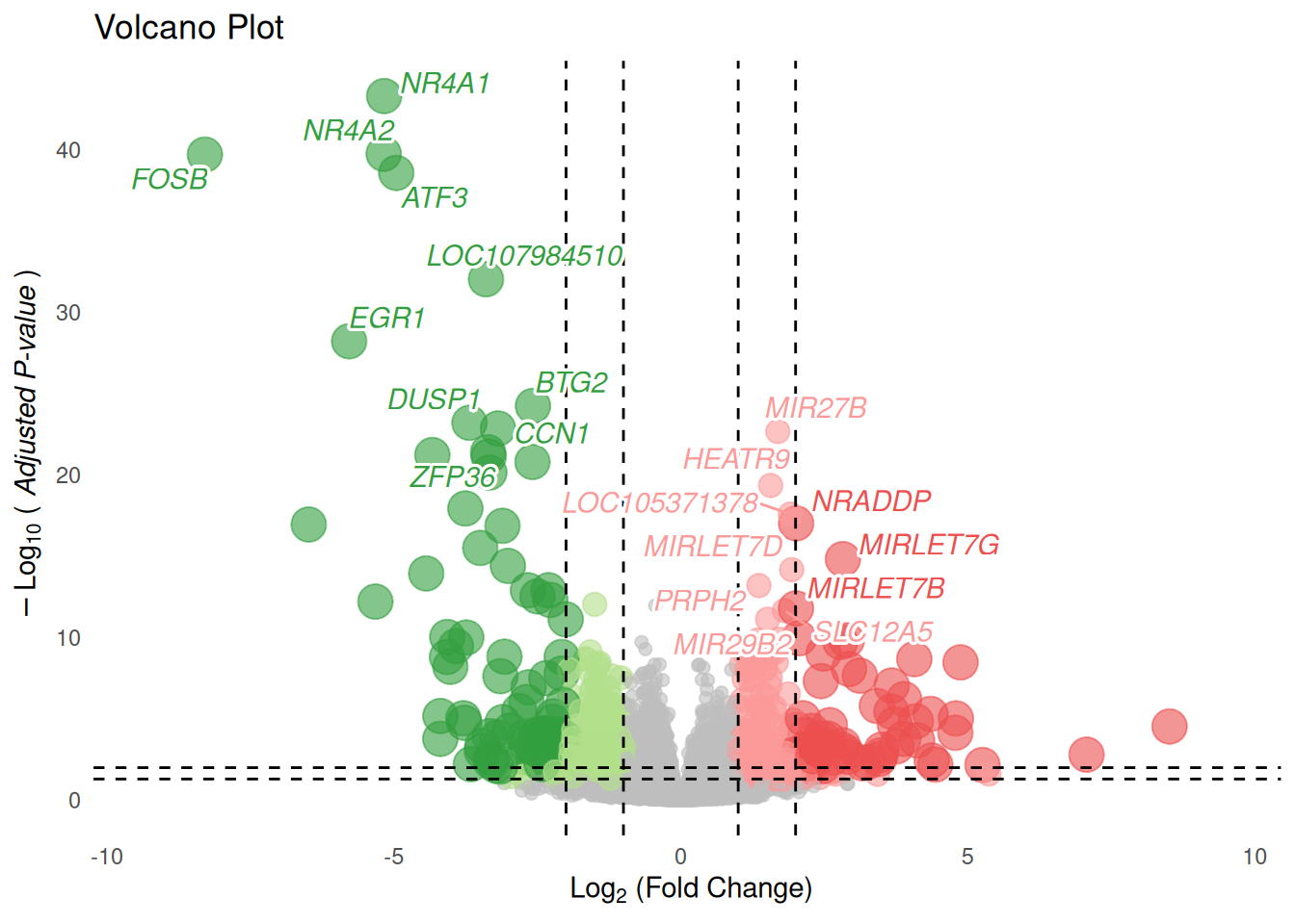 By specifying dual thresholds, ivolcano automatically applies a FigureYa-styled color scheme that clearly separates genes into significance tiers.