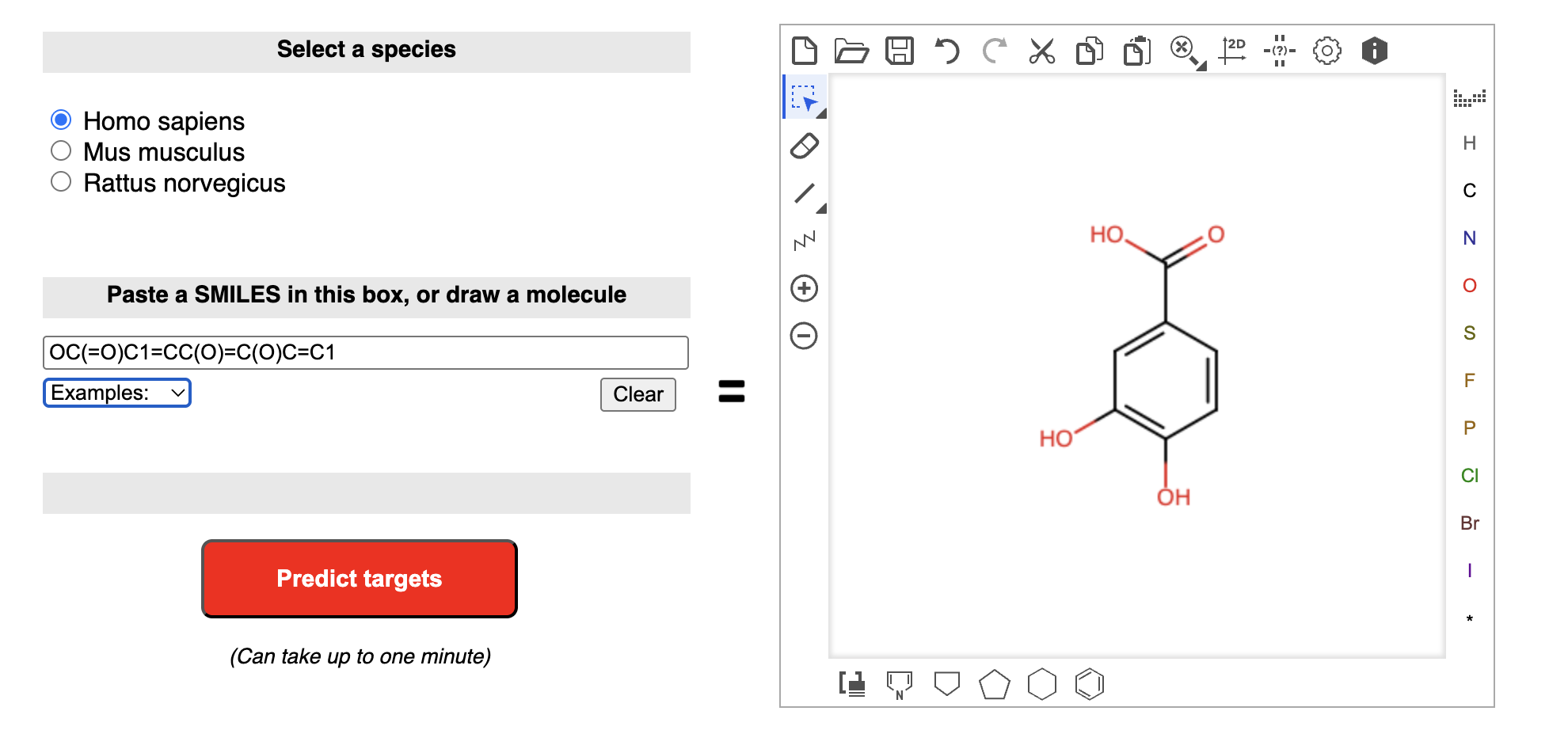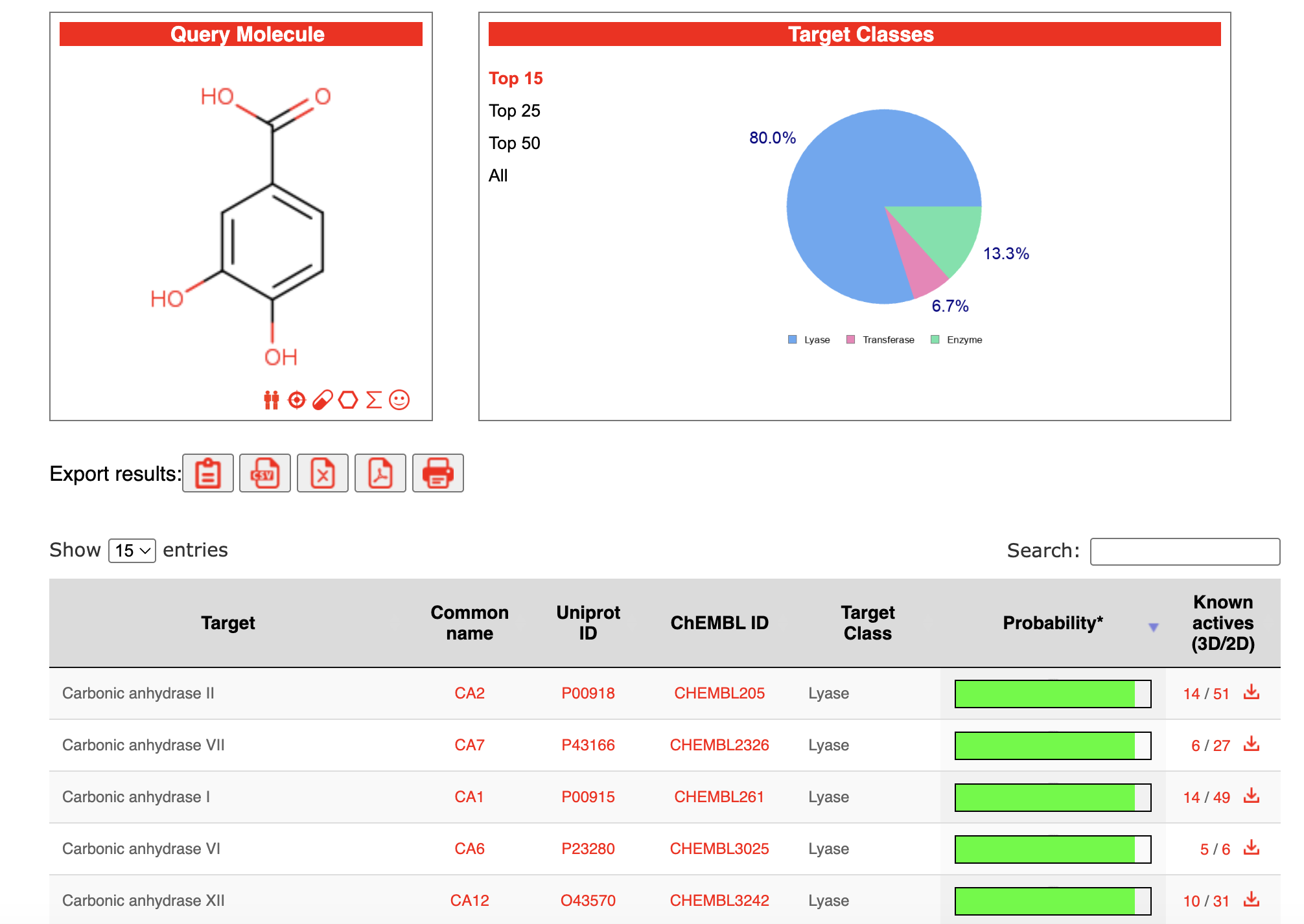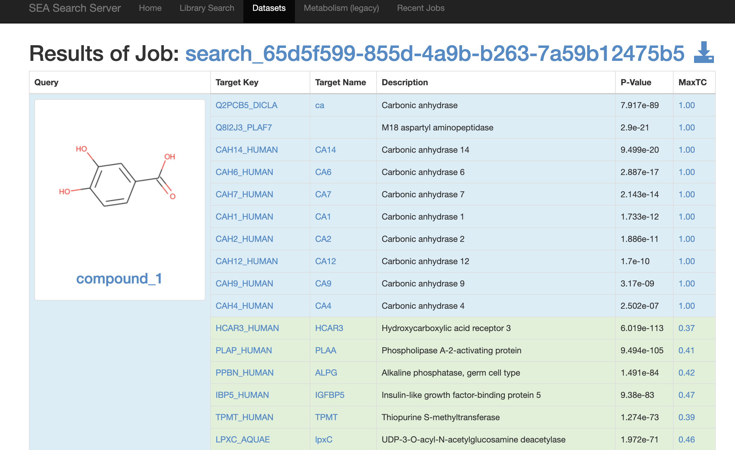 Also, we set “C1=CC(=C(C=C1C(=O)O)O)O” as SEA input, and results are as follows: